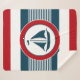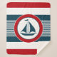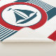 Diseño náutico con decoración de velero en forma redonda sobre fondo rayado azul, rojo y blanco