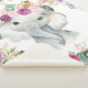 Una manta adorable de temática selvática con un bebe de elefante dulce y una elegante vegetación tropical acuática y flores de color rubio y violeta.