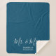 Elegante y divertido, esta manta de sherpa le mantendrá caliente a usted y a su familia este invierno mientras usted se numera en el sofá. El diseño presenta un fondo azul y tipografía manuscrita blanca "Mr. y la señora". El texto del apellido y la fecha + año del boda es el personalizable de encajar en los detalles del boda recién casados. Este es un gran regalo para los recién casados en el boda o post-boda durante las vacaciones.