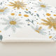 Una encantadora manta botánica con flores estilizadas amarillas y blancas con hojas suaves verde-grises, acentuadas por puntos abstractos y formas en amarillo y negro. El fondo blanco limpio realza su estética fresca, alegre y orgánica, perfecta para los amantes de la naturaleza, los temas primaverales y veraniegos y los temas florales caprichosos.