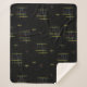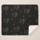 Las gafas y líneas amarillas, borgoñas y blancas en un patrón repetido en un fondo negro sugiere un sentido de movimiento y energía.