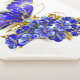 Joyería, azul, zafiro, mariposa floral brillante con ala decorada con flores azules y preciosas con hojas de oro sobre fondo blanco.