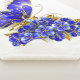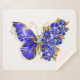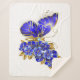 Joyería, azul, zafiro, mariposa floral brillante con ala decorada con flores azules y preciosas con hojas de oro sobre fondo blanco.