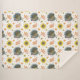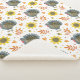 Un patrón acuarela de pavos de color azul-gris, girasoles dorados y bellotas, y corazones y hojas naranjas contra fondo blanco