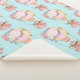 Una manta sherpa con un adorable patrón con un ilustracion acuarela. Un globo de aire caliente decorado con flores bonitos rojas y rosas. Un lindo oso bebé blanco se sienta en la canasta. Fondo azul claro.