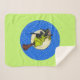 Esta manta de lana de Sherpa es verde brillante con una bruja graciosa sujetando a su gorra con un vestido verde que pasa por delante de una luna llena en una escoba con su gato negro montado sobre su espalda en círculos azules con estrellas.