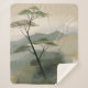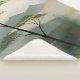 Una serena obra de arte de un árbol delgado con ramas y hojas delicadas, situado sobre un telón de fondo de montañas polvorientas y un tranquilo lago. Las obras de arte presentan una armoniosa mezcla japonesa de colores suaves.