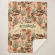 Cuidada manta personalizada de sherpa para niños con ilustraciones mágicos de pequeñas cabañas encaramadas sobre hongos rojos y melocotones, y rodeadas de mariposas, flores y vegetación.