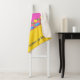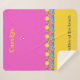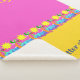 La vida es mejor en la playa, es una manta Sherpa con un friso en el fondo que celebra la vida de la playa, con el sol, palmeras, mar azul y arena dorada. El diseño se complementa con bloques de color rosa y amarillo intenso. Puedes personalizarlo con tu nombre. La obra es un dibujo estilizado original, único, de color digital, dibujado a mano.