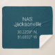 Manta Sherpa con coordenadas de mapa de latitud y longitud para la Estación Aérea Naval de EE.UU. NAS Jacksonville en Florida Tipo Roboto de letra blanca sobre fondo azul de la Marina.