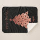 Mantente caliente este invierno usando esta manta Sherpa de árbol de Navidad. Sobre un fondo negro, hay un falso árbol de Navidad de Relieve metalizado rosa en el centro con "Feliz Navidad" escrito en cursiva con tu nombre en el fondo. ¡Haga su pedido de una manta personalizada hoy mismo!