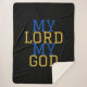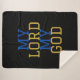 Esta manta muestra las palabras "Mi Señor Dios" en letra negrita con letras de colores azules y dorados en un estilo tipográfico y un tema basado en la fe. Esta manta presenta una imagen vívida en un lado y el Sherpa más suave disponible en el reverso hecho de poliéster 100% y mink impreso con soporte de sherpa ultra suave.