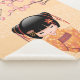 Ilustracion vectorial de un lindo chica oriental con un vestido kimono de color melocotón con un amplio cordón de ciruela con una bolsa de cuerda de inflexión kinchaku rosa. El pelo negro chica está decorado con cintas y peinados de estilo geisha. La muñeca lleva el nombre de un árbol del yume japonés que está relacionado con los árboles de ciruela y albaricoque. Esta obra de arte se inspiró en las tradicionales muñecas kokeshi de Japón. El fondo amarillo claro tiene un patrón de onda japonés tradicional y está decorado con ramas de árbol de yume florecientes.