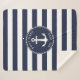 Elegante manta azul marino y blanca con una plantilla para personalizar con tu nombre de barco, año u otro texto. El diseño presenta un ancla blanca dentro de un círculo de cuerda sobre un fondo rayado.