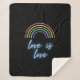 Comfy la manta sherpa con un mensaje simple: el amor es amor - abogando por el amor sin importar la adversidad, orientación o identidad - en texto de escritura neón con el colorido arco iris neón. Lo mejor en el fondo oscuro.