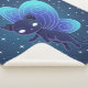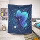 A whimsical illustration of a fairy-like fantasy creature that resembles a cat with colorful butterfly wings. The kitten is hovering in place holding a small star shaped lantern in its front paw.