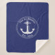 El diseño náutico de esta manta tiene un ancla blanco con un borde circular de cuerda sobre un fondo azul marino. Personalice su nombre familiar y año de establecimiento, o reemplácelo por otro texto.
