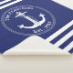 El diseño náutico de esta manta tiene un ancla blanco con un borde circular de cuerda y tres franjas horizontales blancas en cada extremo. Personalice su nombre familiar y año de establecimiento, o reemplácelo por otro texto. El fondo azul marino se puede cambiar a otro color personalizando y seleccionando otro color de fondo.