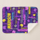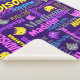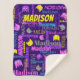 Juego de píxeles de nombre personalizado multicolor en una manta gráfica morada oscura. Esta divertida manta tipográfica de texto rosa, amarillo, púrpura y gris también puede ser personalizada con su propio nombre, actualmente lee Madison. Hay otros nombres disponibles. Arte gráfico y diseño por www.mylittleeden.com