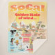 Una escena luminosa y colorida ofrece una vista espectacular del sur de California - personajes extravagantes de los parques de playa y desierto de SoCal que exhiben Los Ángeles, San Diego, Condado de Naranja, Santa Barbara, Riverside, Palm Springs, El Centro, Anza Borrego y Joshua Tree, así como las ciudades fronterizas de Tijuana, Tecate y Mexicali. Esta encantadora escena lo tiene todo - un surfista cuelga diez mientras una ballena asesina salta del agua, animales del zoo saludan a los turistas, una pareja de playa muscular flex para impresionar mientras un T-Rex ruge un desafío y un tanque se mueve en posición y mucho más...