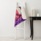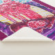 A slice of cake topped with vibrant red raspberries drips with rich sauce onto a dark purple plate. The background features a blue lattice pattern, complementing the dessert's vivid colors.
