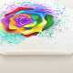 Rosa grande y floreciente con pétalos de arco iris sobre fondo blanco, pintado con salpicaduras de pintura colorida y brillante. 3.ª
