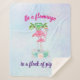 Una manta de sherpa con un lindo dicho: Sé un flamenco en un rebaño de palomas. Diseñado con el ilustracion de una mami y un flamenco rosado de bebé sobre una cama de flores suculentas florales con palmeras verdes que se balancean por la espalda. Tropical y bonito. El fondo es una acuarela azul veraniego con toques de violeta.