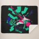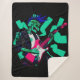 Un esqueleto robótico con un mohawk azul estilo punk toca una guitarra eléctrica rosa brillante que emite ondas de energía eléctrica cuando se toca. el robot usa una chaqueta de cuero negro.