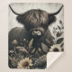 Un toro Highland oscuro y monótono con un girasol para una sofisticada imagen de casa de campo.