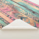 Diseño tribal azteca nativa de acuarela norteamericana con un patrón geométrico suroeste en tonos azul pastel, rosa y naranja sobre un fondo de grano de madera.