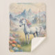 Una imagen de ensueño de un unicornio blanco con un arcoiris en un campo de flores sobre una manta sherpa. En el fondo hay majestuosas montañas. El regalo perfecto para dar a los que aman unicornios mágicos y místicos. Contiene contenido generativo.