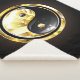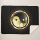 Joyería, oro y símbolo yin yang negro sobre fondo negro. Oro yin yang.