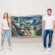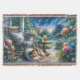 A serene cottage porch scene unfolds beneath a twilight sky filled with drifting stars, where a gentle Sheltie rests among blooming garden flowers. Soft painterly strokes and luminous watercolor tones blend deep blues, mossy greens, blush pinks, and warm amber light, creating a dreamy evening atmosphere. The composition feels nostalgic and peaceful, evoking quiet summer nights, garden paths, and moments of stillness wrapped in nature’s embrace. Whimsical, cozy, and storybook-inspired, this artwork captures the magic of a tranquil cottage garden under the stars. AI generated artwork.