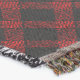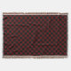 Rústica manta de garabatos oscuros cruzada sobre rojo y con un ligero efecto "tallado" que causó una apariencia manchada que se parece a algunas tiras de lona plástica que han sido presionadas y pegadas en gruesos hilos.