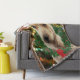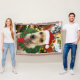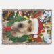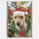 Un cuadro de arte digital de un joven cachorro listo para Navidades con una corona, sombrero de Santa y un árbol decorado.