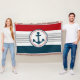 Diseño náutico con decoración de ancla en forma redonda sobre fondo rayado azul, rojo, gris y blanco