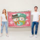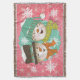 Snowmen Pink y Blue vacaciones con una manta, tan bonito y colorida, con copos blancos de nieve en un fondo rosado y un círculo azul acuático con puntos blancos. Cada lado tiene una sonriente pareja de hombres de nieve con un gorra, bufanda, nariz de zanahoria y copos de nieve.