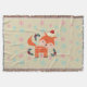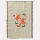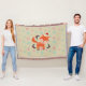 Una encantadora manta de navidades con un toque retro. Un ilustracion de un zorro naranja lindo, con un sombrero de santa roja rodeado de decoraciones huecas de navidades. Un pequeño y dulce animal forestal festivo. Está situado sobre un fondo con copos de nieve rosas y azules.