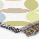 Una repetición de cuartos circulares cortados estilo estampado arrojan colores cálidos tonales de amarillo, naranja, marrón, verde oliva, gris y azul sobre un fondo blanco de Sarah Trett. Se vería genial en un dormitorio, salón.