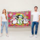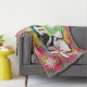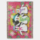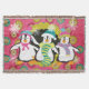 La manta de tiro de los pingüinos de nieve y los pingüinos orbs contiene tres adorables pingüinos en gorras de invierno y pañuelos en un fondo rosado caliente con orbs de copos de nieve, una franja de mostaza con puntas de polka y un centro negro con puntos de polka blanco y copos de nieve.