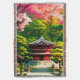 Un tranquilo templo japonés rodeado de flores de cerezo y de árboles verdes.