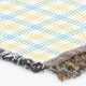 Two images show a woven throw blanket with a pastel yellow and blue checkered pattern. It has fringe edges and is displayed horizontally and vertically.