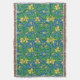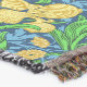 Arrojar en un William Morris, Art Nouveau, impresiones textiles de iris y hojas, realzadas digitalmente y coloreadas, en amarillo dorado, verde y azul suave, sobre un fondo azul cobalto profundo