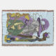 Un mago todo en púrpura sosteniendo un equipo que tiene una bola de cristal morado. Un pequeño dragón verde, nudo celta trabajando, vela y un borde de otoño deja todo en un fondo azul claro