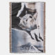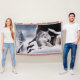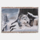 Un lobo en la nieve del invierno con un castillo detrás del lobo.