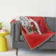 Un hermoso ilustracion acuático de un terrero de Yorkshire sentado en un saco rojo y blanco de piel de faux bordeado de Santa, con un vibrante arco rojo adornado con falso oro. Está rodeado de regalos envueltos de bonito que tienen grandes arcos decorativos y una larga cinta roja serpenteando a través de ellos. Un gran círculo blanco en el fondo tiene las palabras, fleas navidog, en una fuente negra bonito y está enmarcado por un falso fondo rojo satinado.