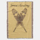 Un par de raquetas cruzadas en un color de fondo que sugiere cuero de cerebro. También aparece un texto que dice "Saludos de temporada". Hay varios estilos diferentes de raquetas de nieve tradicionales. Los que aparecen aquí son de Ash y moosehide babiche (webbing) en el patrón de Alaska. Las raquetas de nieve de Alaska, más largas y más delgadas que otros estilos, como el pepino, permiten una puerta más natural y son perfectas para los viajes de travesía. Las puntas ligeramente volteadas te permiten arrastrar un poco los pies. Se aconseja llevar raquetas de nieve para los excelentes cielos; generalmente en el peor momento posible.
