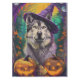 Admire el espíritu de Halloween con este diseño encantador que presenta un perro lindo en un gorra de brujas rodeado de calabazas talladas. Perfecto para añadir un toque de encanto espeluznante a sus celebraciones festivas.