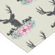 Un mantel con una cabeza de ciervo negra con grandes cuernos. Las líneas geométricas dentro de la cara del ciervo agregan un toque creativo. Flores rosas y coloridas hojas verdes de menta forman un ramo floral de bonito bajo su cabeza. Un sketch de cordillera colocado entre las flores también le da un toque rústico al campo.