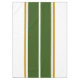 Este diseño deportivo cuenta con bandas de carreras de centro horizontal doble de color verde y ancho extra y pinstripes marrones dorados adyacentes. El fondo es blanco.